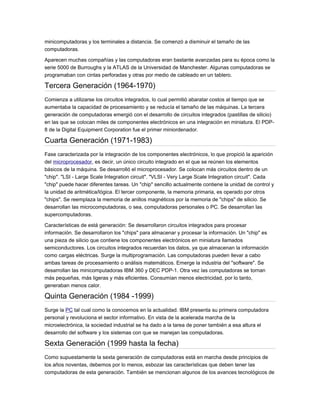 Las primeras computadoras se desarrollaron en la década de 1940 y utilizaban válvulas, tarjetas perforadas y cilindros magnéticos. En la década de 1950 se introdujeron los transistores y lenguajes de programación como FORTRAN. En la década de 1960 los circuitos integrados permitieron computadoras más pequeñas y potentes. En la década de 1970 el microprocesador llevó a las microcomputadoras personales. En la década de 1980 IBM lanzó la primera PC revolucionando la industria. Las computadoras