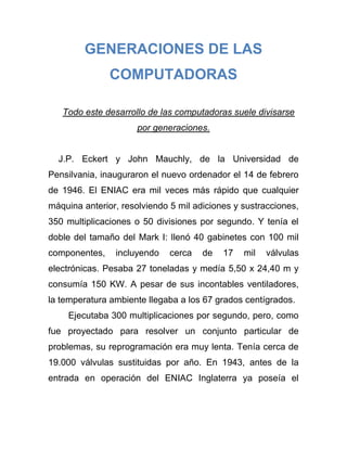 El documento resume las diferentes generaciones de computadoras desde la primera hasta la sexta. Cada generación se caracteriza por avances tecnológicos como el uso de transistores en lugar de tubos de vacío, el desarrollo de circuitos integrados y microprocesadores, y el surgimiento de computadoras personales y portátiles. El documento también describe brevemente algunas tecnologías clave de la quinta y sexta generación como la inteligencia artificial, robótica y sistemas expertos.