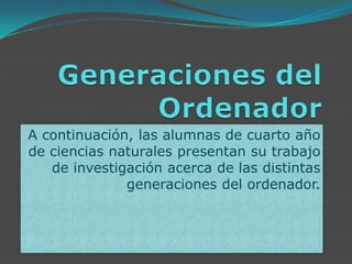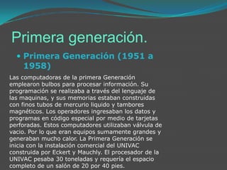 El documento describe las cuatro generaciones de ordenadores, comenzando con la primera generación (1951-1958) que utilizaba bulbos de vacío y tarjetas perforadas, seguida por la segunda generación que introdujo transistores, permitiendo computadoras más pequeñas y eficientes. La tercera generación se caracteriza por la invención del circuito integrado, y la cuarta generación, desde 1971, se enfoca en la microminiaturización, llevando al desarrollo de microcomputadoras y microprocesadores. Cada generación representa un avance significativo en la tecnología de los ordenadores, reduciendo tamaño y aumentando capacidad de procesamiento.