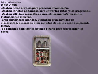El documento describe las cinco generaciones de computadoras. La primera generación usaba tubos de vacío y tarjetas perforadas, mientras que la segunda introdujo los transistores. La tercera generación desarrolló los circuitos integrados y chips de silicio. La cuarta generación incluyó el microprocesador y circuitos más complejos en un solo chip. Finalmente, la quinta generación buscó desarrollar computadoras con inteligencia artificial en el hardware y software.