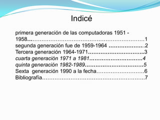 Este documento resume las seis generaciones de computadoras desde 1951 hasta la actualidad. La primera generación utilizaba bulbos para procesar información a través de tarjetas perforadas. La segunda generación introdujo el transistor, haciendo las computadoras más rápidas y pequeñas. La tercera generación emergió con los circuitos integrados. La cuarta generación presentó los microprocesadores. La quinta generación se basó en la inteligencia artificial. Y la sexta generación se centra en las computadoras inteligentes basadas en redes neuronales.