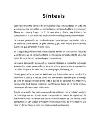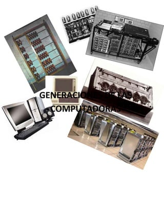 Este documento resume las cinco generaciones de computadoras desde su invención hasta la actualidad. La primera generación usaba tubos de vacío que eran grandes y consumían mucha electricidad. La segunda generación redujo el tamaño y consumo eléctrico al reemplazar los tubos por transistores. La tercera generación introdujo los circuitos integrados y microprocesadores y dispositivos como teclados, discos y videojuegos. La cuarta generación trajo Windows, monitores a color y mouse. La quinta generación incluye supercomputadoras con