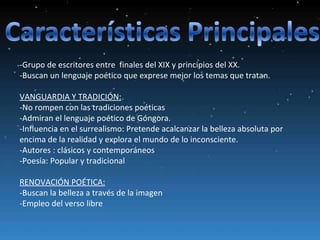 El documento habla sobre el grupo literario conocido como la Generación del 27. Buscaron renovación poética a través de un lenguaje que expresara mejor sus temas y la belleza a través de imágenes. Pasaron por diferentes etapas donde exploraron la poesía pura, el verso libre, y luego la política y la lucha. Algunos de los autores más importantes fueron Federico García Lorca, Rafael Alberti y Vicente Aleixandre.