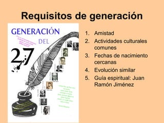 Este documento resume la generación poética española de 1927, destacando sus principales características y autores. Los poetas compartían amistad, actividades culturales comunes y fechas de nacimiento cercanas. Aunque estilísticamente heterogéneos, tenían elementos en común y evolucionaron de forma similar, influenciados por las vanguardias y guiados espiritualmente por Juan Ramón Jiménez en sus inicios. Los principales autores fueron Pedro Salinas, Jorge Guillén, Gerardo Diego, Rafael Alberti y Federico García Lorca.