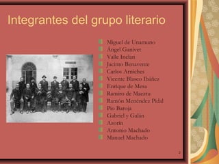 La Generación del 98 fue un grupo literario español que surgió a finales del siglo XIX como reacción al desastre del 98, cuando España perdió sus últimas colonias. Algunos de sus miembros más destacados fueron Unamuno, Valle-Inclán, Baroja, Antonio y Manuel Machado, y Azorín. Se caracterizaron por protestar contra el atraso de España y proponer soluciones, exaltar los valores patrios y usar un lenguaje sencillo.