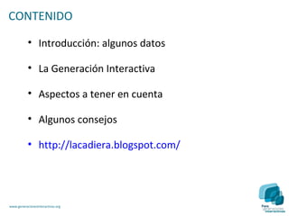 El documento describe las características de la Generación Interactiva y ofrece consejos para padres. Los niños y adolescentes pasan mucho tiempo con pantallas y redes sociales, lo que plantea riesgos como contenidos inadecuados, acoso cibernético y falta de privacidad. No obstante, las nuevas tecnologías también ofrecen oportunidades educativas. El documento recomienda que los padres supervisen la actividad en línea de los hijos, establezcan reglas claras y sirvan de modelo desconectándose a veces.