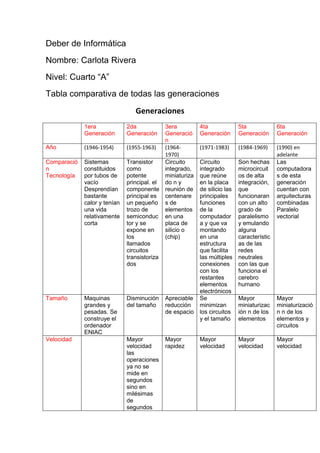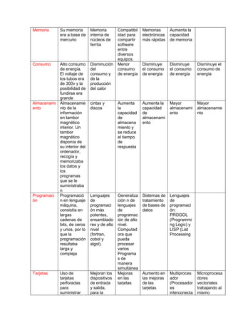 El documento presenta una tabla comparativa de las seis generaciones de computadoras, describiendo las características tecnológicas, de tamaño, velocidad, memoria, consumo de energía, almacenamiento, programación, dispositivos de entrada y salida, y costo de cada generación. También explica que una computadora está dividida en hardware (componentes físicos como teclado, mouse, discos duros) y software (programas y sistemas operativos).