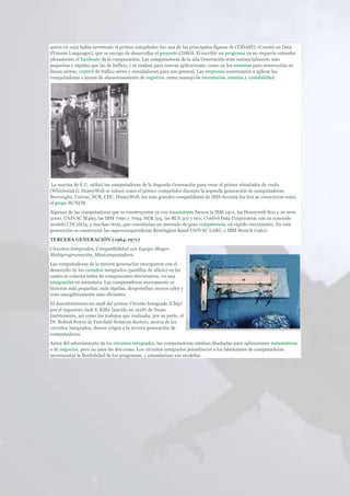 La primera generación de computadoras (1951-1958) utilizó bulbos para procesar información y almacenamiento magnético. La segunda generación (1959-1964) introdujo el transistor, haciendo las computadoras más rápidas y pequeñas. La tercera generación (1964-1971) usó circuitos integrados, lo que permitió computadoras más flexibles y compatibles entre sí.