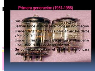 El documento describe las generaciones de computadoras desde la primera hasta la sexta. La primera generación usaba tubos de vacío y tarjetas perforadas, la segunda usaba transistores, la tercera desarrolló circuitos integrados, la cuarta el microprocesador, la quinta las microcomputadoras y supercomputadoras, y la sexta las computadoras portátiles, de bolsillo y ópticas.