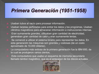 Las primeras computadoras usaban tubos de vacío y tarjetas perforadas, eran grandes, usaban mucha energía y eran lentas. La segunda generación usó transistores en lugar de tubos, haciéndolas más pequeñas y eficientes. La tercera generación introdujo circuitos integrados, reduciendo aún más el tamaño y mejorando el rendimiento.