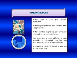 La primera generación de computadoras usaba tubos de vacío y tarjetas perforadas. La segunda generación usó transistores en lugar de tubos de vacío. La tercera generación desarrolló circuitos integrados y chips. La cuarta generación introdujo el microprocesador y las microcomputadoras personales.