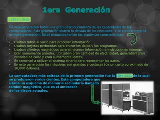 El documento resume las cinco generaciones de computadoras desde 1951 hasta la actualidad. Cada generación se caracteriza por cambios tecnológicos como el uso de tubos de vacío, transistores y circuitos integrados que hicieron que las computadoras fueran más pequeñas, rápidas y eficientes. La quinta generación se enfoca en inteligencia artificial, robótica y sistemas expertos.