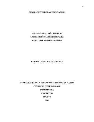 La primera generación de computadoras utilizó bulbos para procesar información y almacenamiento mediante tambores magnéticos. La segunda generación fue más pequeña y rápida, usándose para aplicaciones como reservaciones aéreas. La tercera generación introdujo los circuitos integrados, haciendo las computadoras más pequeñas y eficientes. La cuarta generación introdujo los microprocesadores y las computadoras personales.