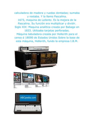 El documento habla brevemente sobre la historia de las computadoras desde 1946 hasta la actualidad, mencionando las diferentes generaciones por las que han pasado. Explica que se remontan a 3000 a.C. con el uso de dedos y cuentas, y describe algunas de las primeras máquinas calculadoras mecánicas inventadas entre los siglos XVII y XIX, incluyendo la Pascalina y las máquinas de Leibniz, Babbage y Hollerith.