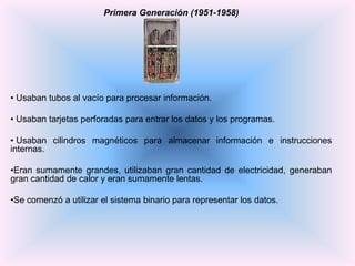 Este documento resume las cinco generaciones de computadoras, describiendo las tecnologías clave utilizadas en cada generación para procesar y almacenar información. La primera generación utilizó tubos de vacío, tarjetas perforadas y cilindros magnéticos. La segunda generación introdujo los transistores. La tercera generación desarrolló los circuitos integrados. La cuarta generación introdujo los microprocesadores. La quinta generación se centró en la inteligencia artificial, la robótica y los sistemas expertos.