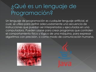 Este documento resume las diferentes generaciones de lenguajes de programación. Comienza explicando que un lenguaje de programación se utiliza para definir secuencias de instrucciones que pueden ser ejecutadas por una computadora. Luego describe las cuatro generaciones principales de lenguajes de programación, desde los lenguajes de bajo nivel como el lenguaje de máquina hasta los lenguajes de alto nivel orientados a objetos. Finalmente, brinda más detalles sobre las características de cada generación.