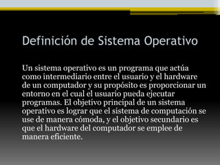 El documento describe las cuatro generaciones de sistemas operativos desde la década de 1940 hasta la actualidad. La primera generación introdujo el primer sistema operativo en la década de 1950 para mejorar la eficiencia al cambiar entre tareas. La segunda generación desarrolló la multiprogramación y el multiprocesamiento. La tercera generación comenzó en 1964 con sistemas operativos más avanzados para múltiples usuarios interactivos. La cuarta generación incluye los sistemas operativos actuales y el surgimiento de las computadoras personales.