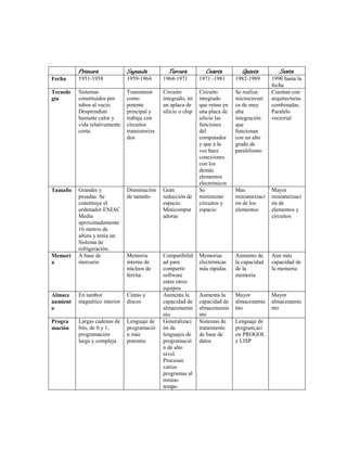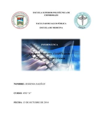 Este documento describe las seis generaciones de computadoras desde 1951 hasta la actualidad, destacando los cambios en la tecnología, tamaño, memoria, almacenamiento, programación y tarjetas. También explica las partes principales del hardware y software de una computadora, incluyendo la placa base, CPU, RAM, dispositivos de entrada y salida, y ejemplos de sistemas operativos y aplicaciones.