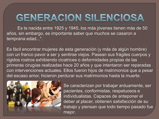 Este documento describe las características de varias generaciones, incluyendo la Generación Silenciosa (1925-1945), la Generación Baby Boomers (1946-1964), la Generación X (1965-1982), la Generación Y (1983-1995) y la Generación Z (1993-2000). Cada generación se vio influenciada por los eventos históricos que ocurrieron durante su tiempo y desarrolló actitudes y estilos de vida únicos.