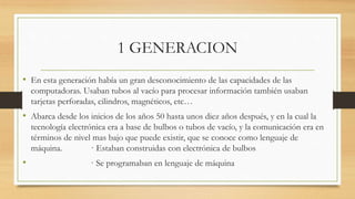 El documento describe las 5 generaciones tecnológicas de computadoras. La primera generación usaba tubos de vacío y tarjetas perforadas. La segunda introdujo los transistores. La tercera trajo los circuitos integrados. La cuarta generación incluyó los microprocesadores. Y la quinta generación, impulsada por Japón, buscaba lograr inteligencia artificial a nivel de lenguaje de máquina.