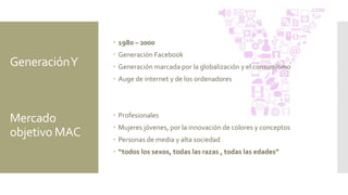 Este documento describe el mercado objetivo y las estrategias de marketing de la marca de cosméticos MAC. Se dirige principalmente a mujeres jóvenes de la Generación Y nacidas entre 1980-2000, conocidas por su estilo de vida globalizado y consumista. MAC se hizo popular inicialmente entre profesionales de la industria de la moda y ahora atrae a personas de todos los sexos, razas y edades a través de campañas con celebridades y colaboraciones con marcas reconocidas.