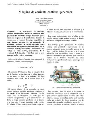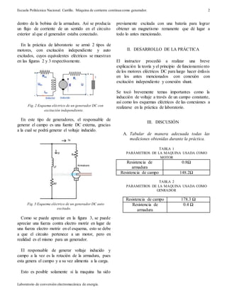 Este documento describe el funcionamiento de una máquina de corriente continua como generador. Explica que al girar las espiras en el devanado de armadura inducen un voltaje dependiente de la velocidad de giro y del flujo magnético. Presenta las mediciones realizadas en la práctica de laboratorio con un generador con excitación independiente y autoexcitado, incluyendo las curvas de saturación y de carga. Finalmente, analiza los resultados obtenidos y explica conceptos como la resistencia crítica y los procesos de autoexcit