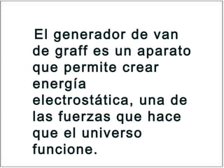El generador de Van de Graff es un aparato que crea energía electrostática, una de las fuerzas fundamentales del universo, mediante el uso de cintas transportadoras para acumular carga eléctrica estática en una esfera metálica.