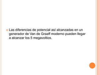 El generador de Van de Graaff acumula grandes cantidades de carga eléctrica en una esfera metálica hueca mediante el uso de una cinta móvil, lo que permite alcanzar diferencias de potencial de hasta 5 megavoltios; sus aplicaciones incluyen la producción de rayos X, esterilización de alimentos y experimentos de física de partículas y nuclear.