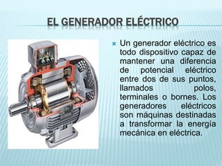 Un generador eléctrico transforma energía mecánica en energía eléctrica mediante la inducción electromagnética. Funciona gracias a la interacción entre un rotor móvil y un estátor estático. Existen generadores de corriente continua y de corriente alterna, siendo los trifásicos los más comunes. Estos pueden conectarse en configuración estrella o triángulo, lo que afecta sus características eléctricas como la potencia total.