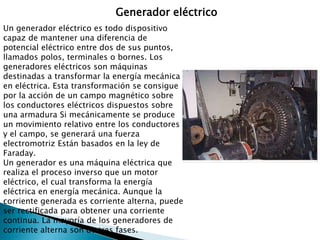 Un generador eléctrico transforma energía mecánica u otra forma de energía en energía eléctrica mediante la inducción electromagnética. Los generadores pueden clasificarse como primarios si convierten energía de otra forma en eléctrica o secundarios si primero almacenan energía eléctrica y luego la convierten de nuevo en energía eléctrica. Las centrales eléctricas contienen grandes generadores que producen energía a partir de fuentes como la combustión, la energía hidráulica o la energía nuclear.