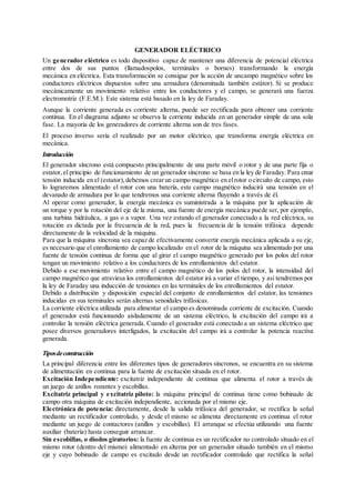 Un generador eléctrico convierte energía mecánica en eléctrica utilizando un campo magnético sobre conductores en una armadura, funcionando principalmente bajo la ley de Faraday. Los generadores síncronos, compuestos por rotor y estator, producen corriente alterna que puede ser rectificada a continua, y su tipo de excitación varía según su construcción. Existen diferentes tipos de generadores eléctricos, incluidos los de energía solar, eólica, nuclear y de combustibles fósiles, cada uno convertido en electricidad mediante distintos mecanismos.