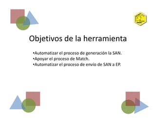 Este documento describe una herramienta para generar de forma automática la Student Acceptance Note (SAN) para apoyar el proceso de emparejamiento. La herramienta requiere que el comité local complete un formulario con la información del estudiante y luego puede generar y enviar por correo electrónico la SAN PDF. La herramienta también permite realizar comentarios y revisiones del correo electrónico antes de enviarlo.