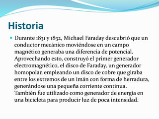 Michael Faraday descubrió en 1831 que un conductor moviéndose en un campo magnético podía generar una corriente eléctrica. Esto llevó al desarrollo del primer generador electromagnético y marcó el comienzo de la era de la generación de energía eléctrica. Los generadores transforman energía mecánica en energía eléctrica mediante la inducción electromagnética. Modelos posteriores como la dinamo de Pixii en 1836 y la dinamo de Pacinotti en 1860 mejoraron el diseño para producir corriente