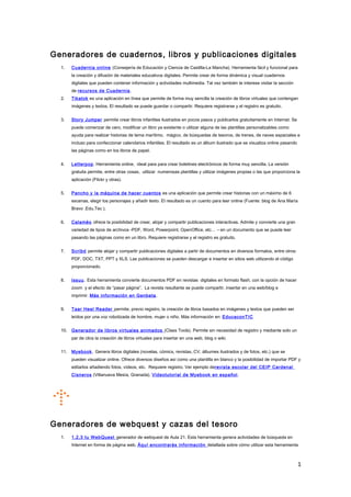 Este documento presenta una lista de 25 generadores de documentos digitales como cuadernos, libros, publicaciones, webquest, cazas del tesoro, cuestionarios y ejercicios. Algunos generadores permiten crear estos recursos de forma sencilla online mientras que otros generan archivos PDF listos para imprimir. La mayoría son herramientas gratuitas que no requieren registro.