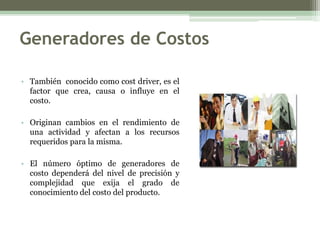 El documento describe los generadores de costos y sus características. Los generadores de costos son factores que influyen en los costos y causan cambios en las actividades y los recursos requeridos. Deben tener una clara relación con las actividades, inducir conductas beneficiosas, y ser fáciles de medir e interpretar. Existen diferentes tipos de generadores que capturan costos de manera distinta dependiendo del contexto.