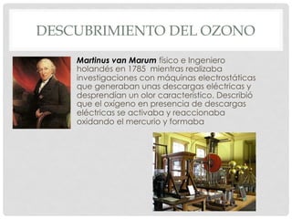 El documento describe el descubrimiento, generación y características del ozono, enfatizando su composición y los métodos de producción, tanto natural como artificial. Se detallan los generadores de ozono médico, sus parámetros de operación y las especificaciones técnicas y de seguridad necesarias para su funcionamiento efectivo en ozonoterapia. Además, se abordan los métodos de control de la concentración de ozono y su cálculo para aplicaciones terapéuticas, destacando la importancia de la precisión en la medición y la calidad de los materiales utilizados.