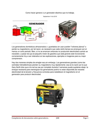 El documento explica cómo revivir generadores eléctricos que han perdido su magnetismo, detallando dos métodos principales: usar una batería de 12V o un taladro eléctrico para excitar el generador. También se enfatiza la importancia de las conexiones eléctricas adecuadas y la polaridad, así como el procedimiento para medir la resistencia y verificar componentes como escobillas y excitadores. Se destacan precauciones de seguridad al manipular conexiones eléctricas, especialmente en situaciones de emergencia.