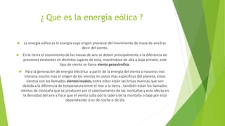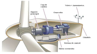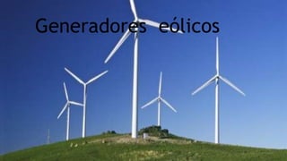 El documento describe los principales componentes y funcionamiento de los generadores eólicos. Explica que la energía eólica proviene del movimiento del viento y que los generadores eólicos convierten la energía cinética del viento en energía eléctrica a través de una turbina conectada a un generador. También detalla los tres tipos principales de generadores eólicos y sus sistemas de control y frenado automatizados.
