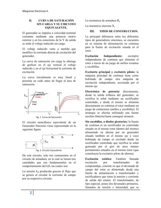 Este documento describe los tipos principales de diseño y construcción de generadores síncronos. Explica que estos generadores están compuestos por un rotor móvil y un estator fijo, y funcionan convirtiendo energía mecánica en energía eléctrica a través de la ley de Faraday. Luego resume tres tipos comunes de diseño: con polos salientes en el rotor, con polos salientes en el estator, y sin escobillas. Para cada uno destaca sus características de potencia, velocidad y forma de extraer o ingresar la tensión