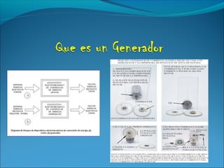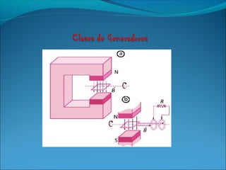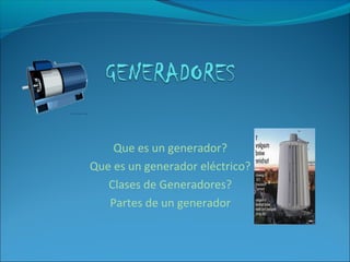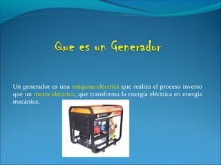 Un generador es una máquina eléctrica que convierte energía mecánica en energía eléctrica mediante el proceso inverso de un motor eléctrico. Los generadores eléctricos mantienen una diferencia de potencial entre sus polos para transformar la energía mecánica en eléctrica según la ley de Faraday. Existen dos tipos principales de generadores: los de corriente alterna, que se basan en la inducción electromagnética, y los de corriente continua como las dinamos, que convierten la energía mecán