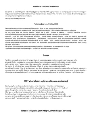 El documento proporciona una guía general sobre la educación alimentaria. Explica que hay cinco tipos básicos de alimentos que son importantes para una dieta saludable y equilibrada: proteínas, grasas, frutas y verduras, cereales integrales y productos lácteos. Cada sección describe las fuentes y los beneficios nutricionales de cada tipo de alimento. También cubre temas como los carbohidratos, las proteínas y los tipos de grasas. El objetivo general es educar sobre una dieta variada y balanceada para mantener