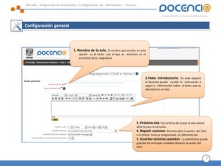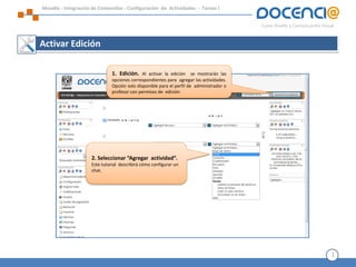 Este documento proporciona instrucciones sobre cómo configurar tareas en Moodle. Explica que los administradores y profesores pueden agregar tareas activando la edición y seleccionando "Agregar actividad". Luego, detalla las opciones de configuración general como el nombre, texto introductorio, fecha de entrega, repetición y almacenamiento de sesiones pasadas. También cubre la configuración del modo de grupo y la visibilidad de la tarea.