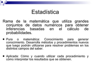 1) El documento presenta información general sobre bioestadística, incluyendo las definiciones de variables, población, muestra, parámetros y estimadores. 2) Explica que la bioestadística aplica métodos estadísticos a problemas biológicos y de salud, pudiendo ser descriptiva u analítica. 3) Detalla las diferentes escalas de medición de variables, así como medidas de tendencia central y dispersión utilizadas en bioestadística.