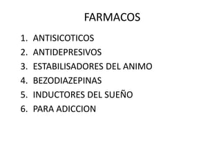 Este documento resume diferentes tipos de fármacos psicotrópicos, incluyendo antipsicóticos, antidepresivos, estabilizadores del estado de ánimo, benzodiacepinas e inductores del sueño. Describe las características, usos y efectos adversos de medicamentos comunes dentro de cada categoría.