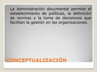La administración documental permite establecer políticas y normas que facilitan la gestión en las organizaciones. Su objetivo es servir la información de manera precisa, ágil y oportuna a quienes la requieran. Incluye controlar, mantener, almacenar, eliminar y recuperar la información existente en una empresa. La gestión documental es una actividad ligada a los archivos que busca la transparencia administrativa mediante el programa de gestión documental, el cual incluye tablas de retención documental y la organización de archivos según el