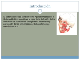 Este documento describe el sistema estomatognático, incluyendo sus componentes principales como los dientes, maxilares, músculos y articulaciones. Explica las funciones clave de masticación, deglución, respiración, fonación y postura. También define la diferencia entre un sistema y un aparato, y describe los músculos involucrados en la masticación y los pasos del proceso de deglución.