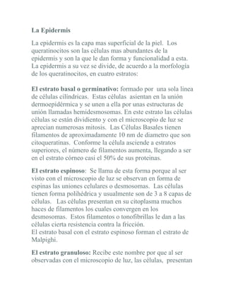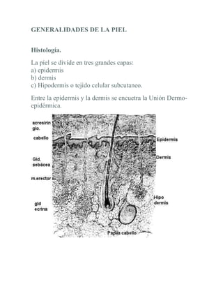 La piel está compuesta de 3 capas principales: la epidermis, la dermis y la hipodermis. La epidermis contiene queratinocitos y se divide en 4 estratos. La dermis está hecha de tejido conectivo y soporta a la epidermis. Contiene fibroblastos, vasos sanguíneos y otros. La hipodermis está compuesta de tejido adiposo. La piel también contiene anexos como folículos pilosos, glándulas sebáceas y sudoríparas.