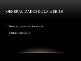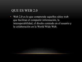 La Web 2.0 facilita el compartir información y la colaboración entre usuarios. Reduce los costos de difusión de información y democratiza los medios, permitiendo que cualquier persona publique. Algunas herramientas clave son blogs, redes sociales, wikis y plataformas para compartir videos, imágenes y presentaciones.
