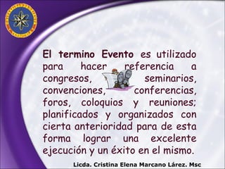 Este documento define los conceptos de evento y tipos de eventos como congresos, convenciones y seminarios. Explica los pasos básicos para organizar con éxito cualquier evento, incluyendo la programación, realización y finalización. Los pasos clave son definir la fecha, lugar y objetivos; elaborar invitaciones; preparar el sitio y recursos; y realizar un seguimiento posterior incluyendo agradecimientos.