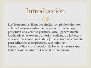 Los trematodos, llamados duelas, son parásitos planos con ventosas oral y ventral. Presentan ciclo de vida complejo con reproducción asexual en moluscos e intermediarios y sexual en vertebrados definitivos. Pueden infectar al ser humano al penetrar la piel, ingerir metacercarias en vegetales o consumir pescado, cangrejos o moluscos infectados. Se clasifican en intestinales, hepáticos, pulmonares o sanguíneos según su localización en el huésped.